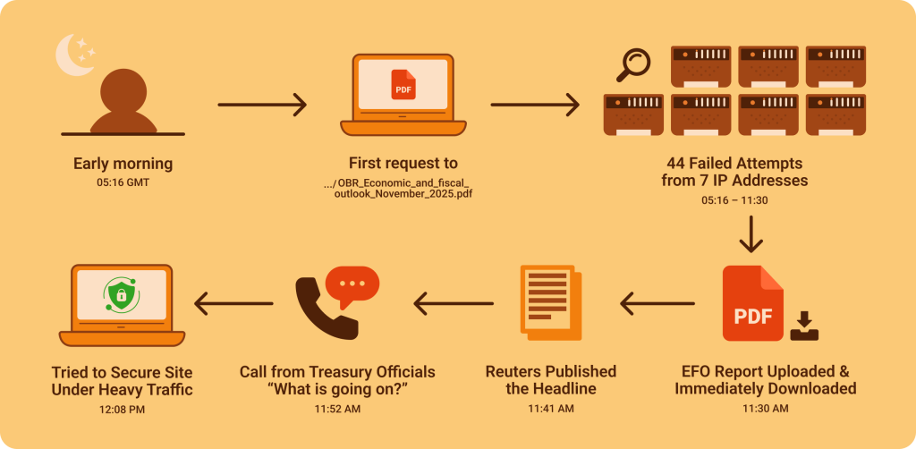 Log files indicate that someone began probing the OBR site early in the morning. At 05:16 GMT, the first request hit the path .../OBR_Economic_and_Fiscal_Outcome_November_2025.pdf. Between then and 11:30, there were 44 unsuccessful attempts from seven distinct IP addresses, suggesting that the observers were guessing the month in the URL based on previous reports.