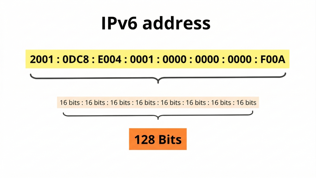 An IPv6 address looks like a long string of letters and numbers, separated by colons, for example: 2001:0db8:85a3::8a2e:0370:7334. This format may seem complicated, but it provides a virtually unlimited number of unique addresses.
