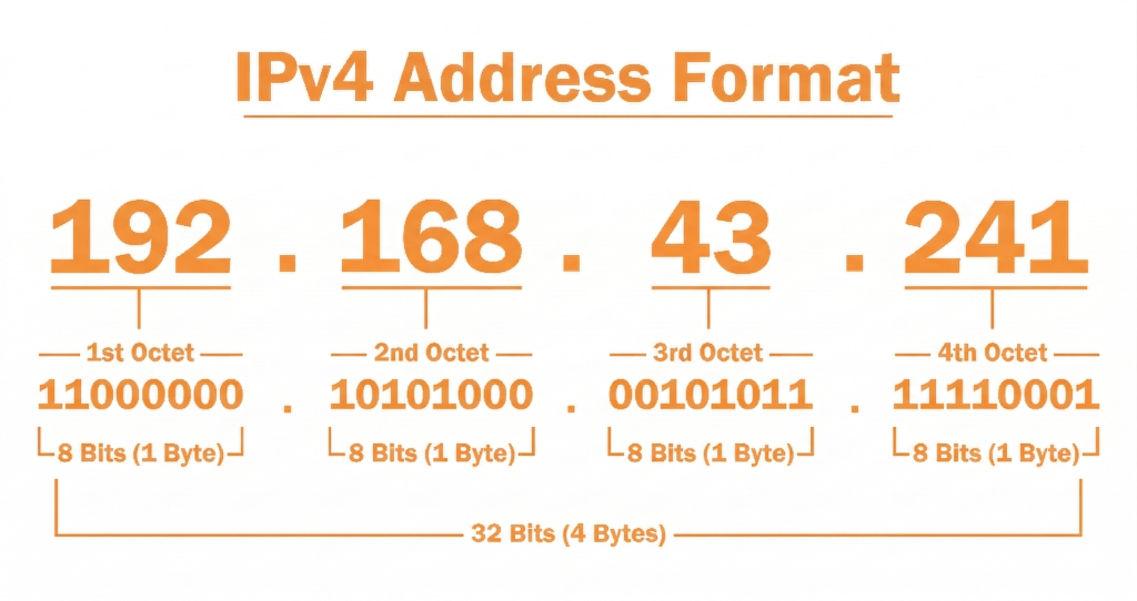 An IPv4 address is made up of four numbers separated by dots, like this: 192.168.1.1. Each number can range from 0 to 255. This format has been around since the 1980s and worked well for a long time.
