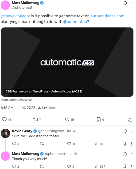 The complaint surprised many in the WordPress community for several reasons. Earlier in the summer, Mullenweg had a friendly chat with Geary on Twitter, asking him to clarify that Automatic.css wasn’t affiliated with Automattic. They exchanged a few kind words, and Geary made the necessary adjustments.