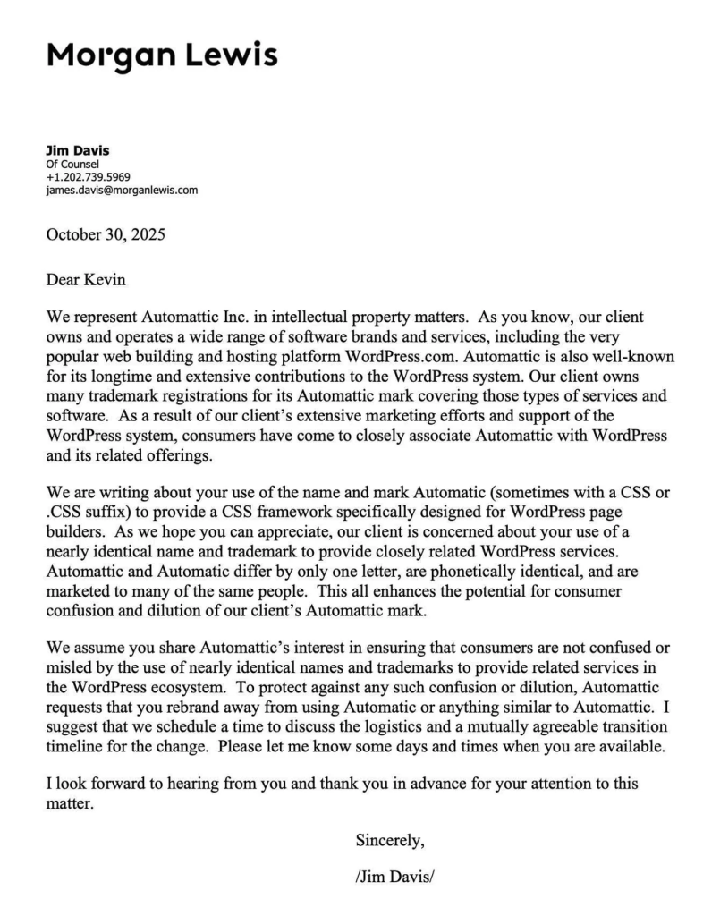 Geary shared a copy of the letter on Twitter. The legal team argued that Automatic.css sounds too much like Automattic and could mislead WordPress users.