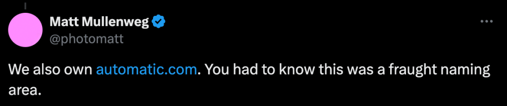 Mullenweg responded on Twitter, noting that he “owns the automatic.com domain,” suggesting that the naming space was already occupied. Bold move!