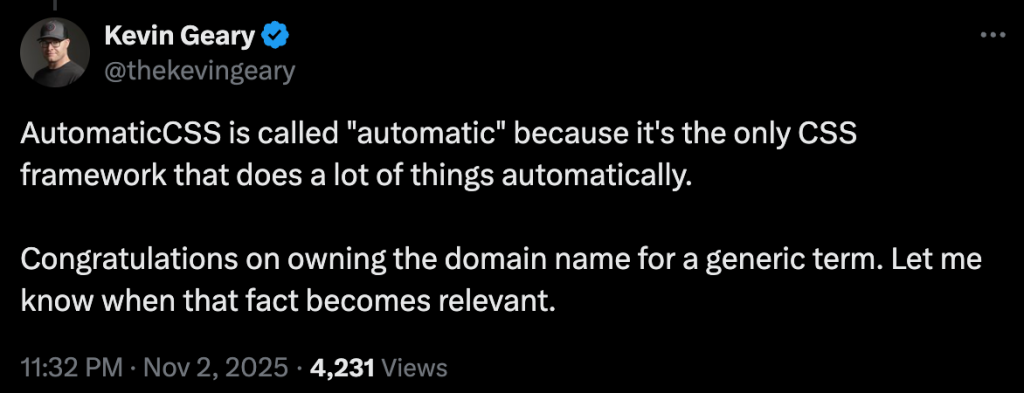 On October 30, 2025, Automattic (founded by WordPress co-founder Matt Mullenweg) filed a formal complaint against developer Kevin Geary. The issue revolved around Geary’s use of “Automatic” in the name of his CSS framework aimed at the WordPress ecosystem. Automattic’s legal team argued that the name Automatic.css could create confusion with the Automattic brand.