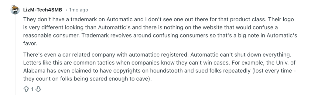 Other participants emphasized a key legal point: Automattic does not hold a trademark for the word “Automatic,” especially not in the relevant product category.