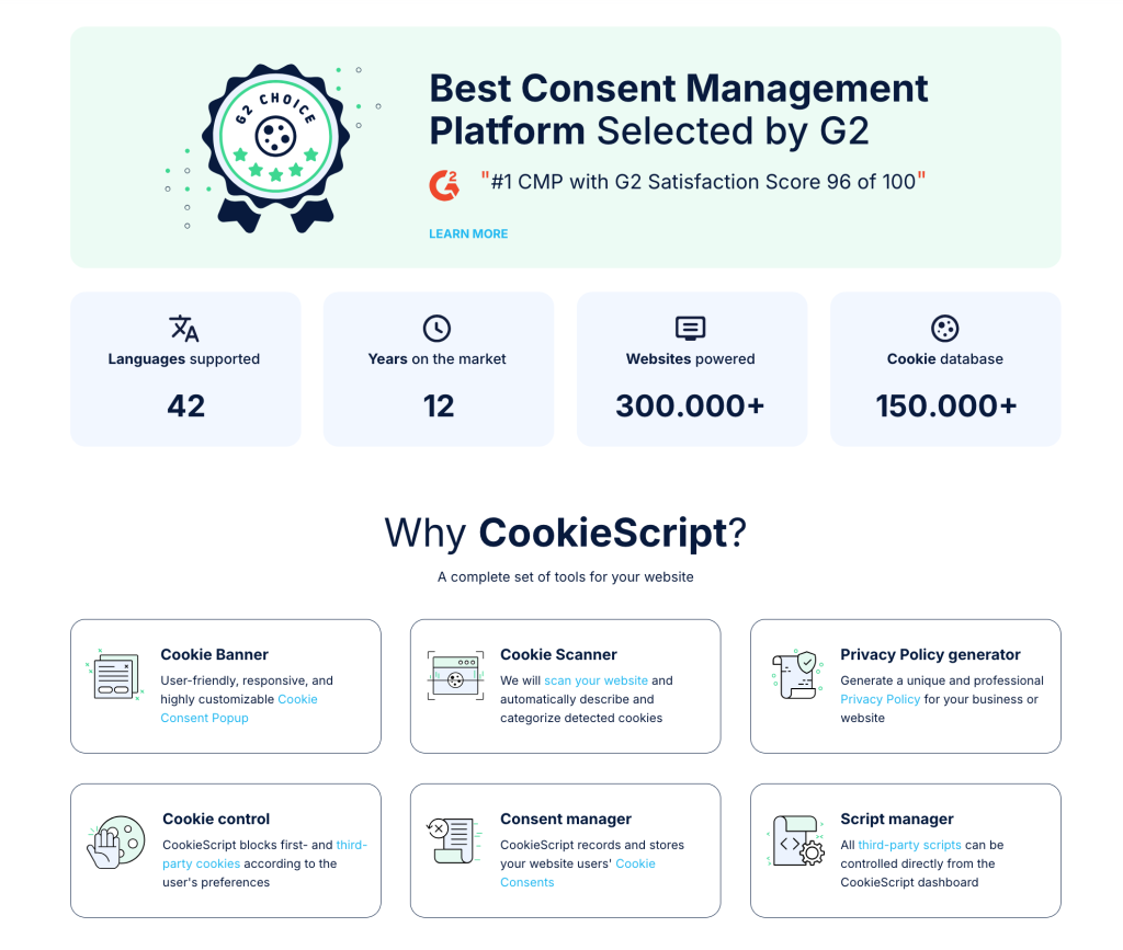 The system supports multilingual interfaces, simple integration through a single script, and basic reporting to help organizations comply with GDPR and similar regulations.