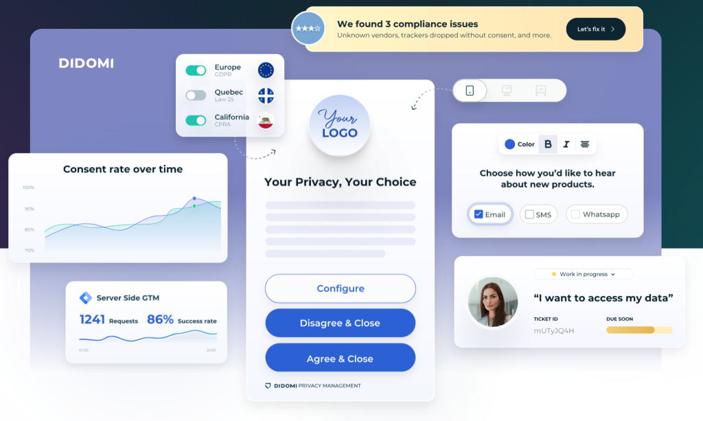 Didomi stores user decisions in a centralized database with metadata such as timestamp, source, and consent type for auditing and reporting purposes. The platform supports jurisdiction-based configuration, multi-site deployments, and provides APIs and SDKs for integration with external systems (such as marketing and analytics tools) to synchronize consent status across platforms.
