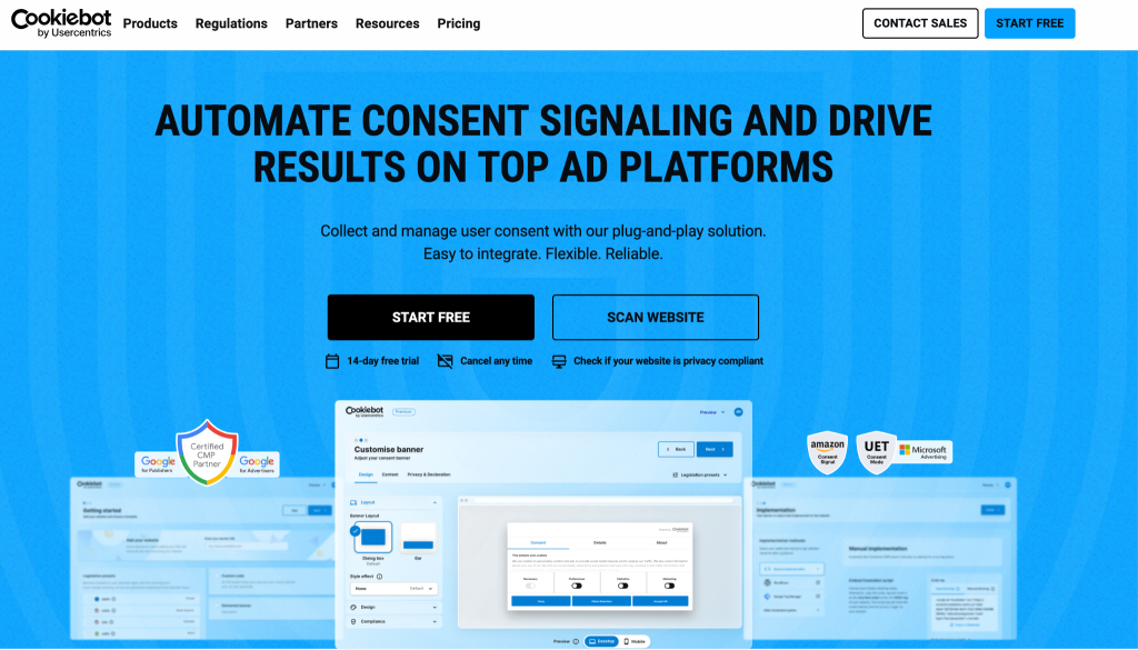 The platform scans a website for all cookies and third-party scripts, automatically categorizes them, and displays relevant information about each one to users. The tool integrates with websites through prebuilt SDKs and tag managers and enables consent banners or popups that comply with the requirements of different jurisdictions.